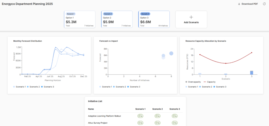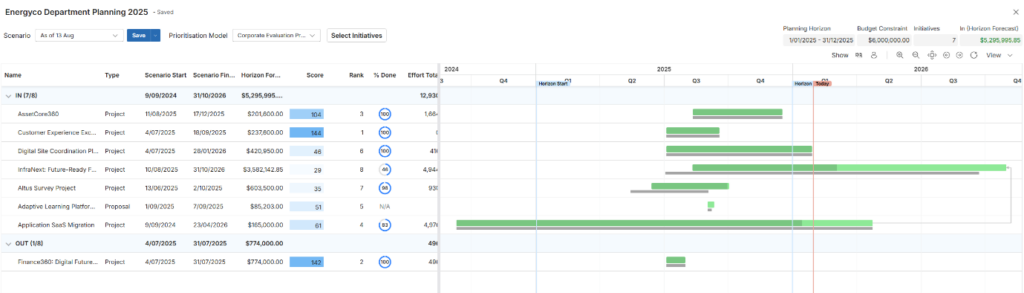 If your budget is suddenly cut by 15%, you don’t need to start searching the local storage drives for the previous version of the planning on spreadsheet, finding data buried in old emails trying to make sense out of them with the team and then having to manually enter the numbers on a spreadsheet to re score initiatives or recalculate allocations. Instead, you open the pre built 85% funding scenario. The optimal portfolio is already calculated, the resource capacity has been updated to-date the initiatives that fall below the threshold are clear, and the trade offs – impact, cost, timing – are quantified. You can adjust from there and move straight to decision-making, not coordinating for model rebuilding.