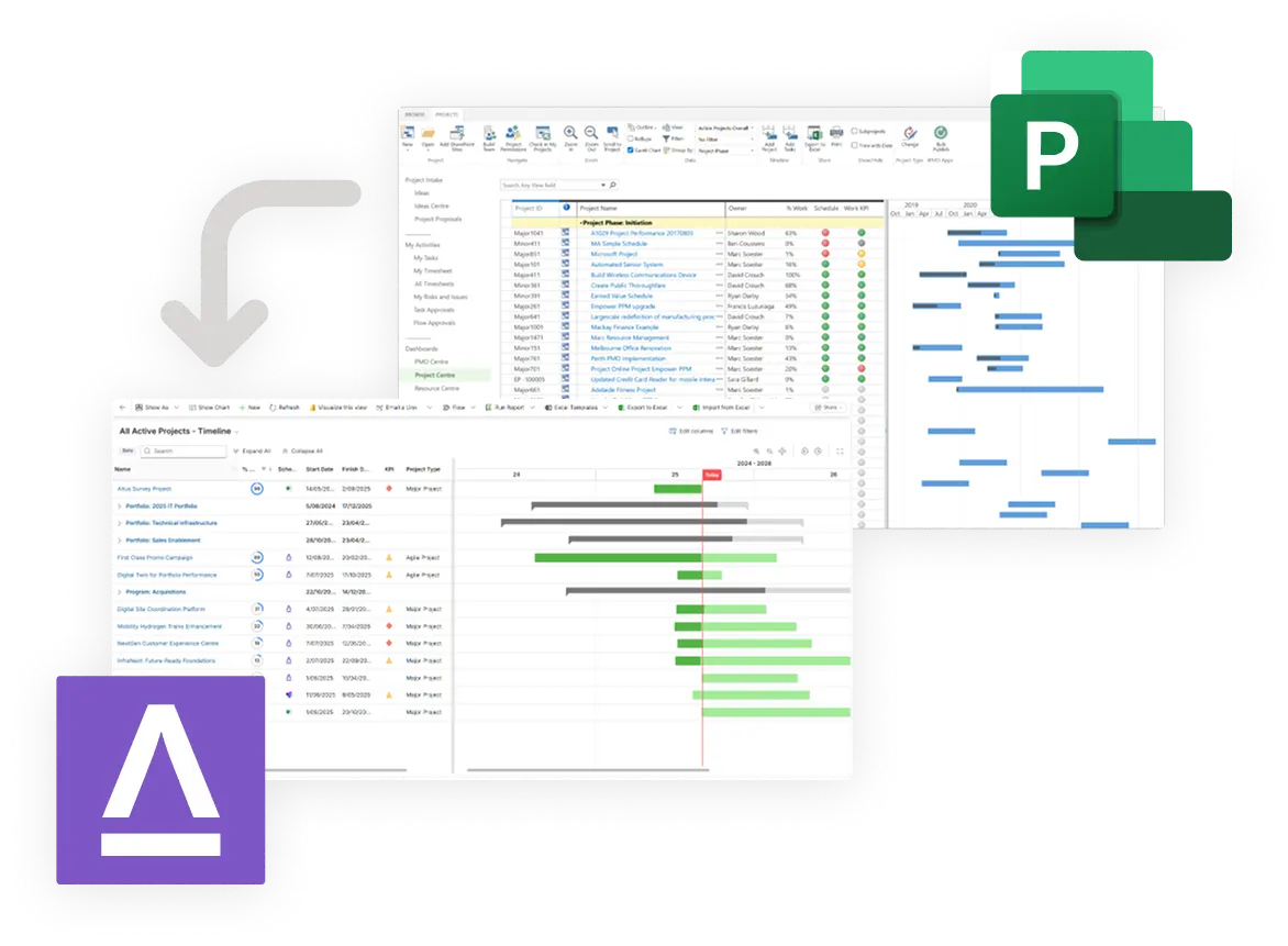 Keep complex schedules in Microsoft Project Desktop and lightweight work in Planner or Planner Premium. Altus unifies them in one portfolio view with consolidated timelines.
